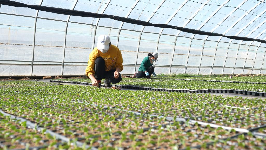 3月29日,土默特左旗農戶正在育苗大棚內檢查果蔬苗培育情況,對多余雜草進行摘除。(受訪者供圖)
