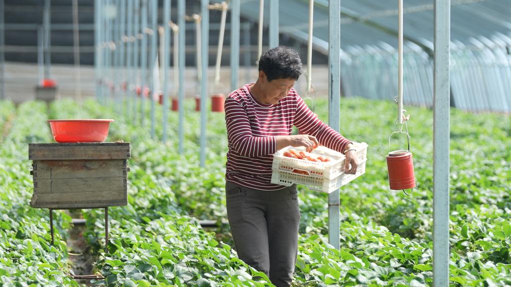 土默川平原的春天在大棚里打工的村民的臉上。當下正是草莓豐收的季節,鮮紅嬌嫩的草莓很快就從一壟壟翠綠的植株間,來到摘果工人的塑料筐里,隨后又進到精美的包裝盒里。阿勒坦農牧業發展投資有限責任公司在土左旗共有3個設施果蔬基地,位于北什軸鄉卡臺基村的基地以草莓種植為主。這里的草莓進入采摘期后,可日產草莓約2000公斤,讓周邊不少農民在家門口實現了打工就業。