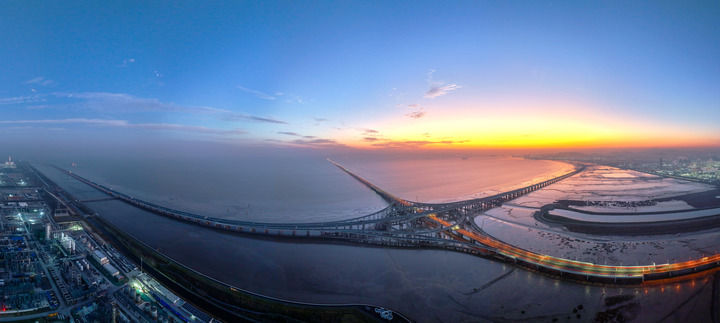 2023年11月29日拍攝的杭紹甬高速跨金塘大橋的濱?;ネ▍^及沿海高架(無人機照片)。新華社發(姚峰 攝)