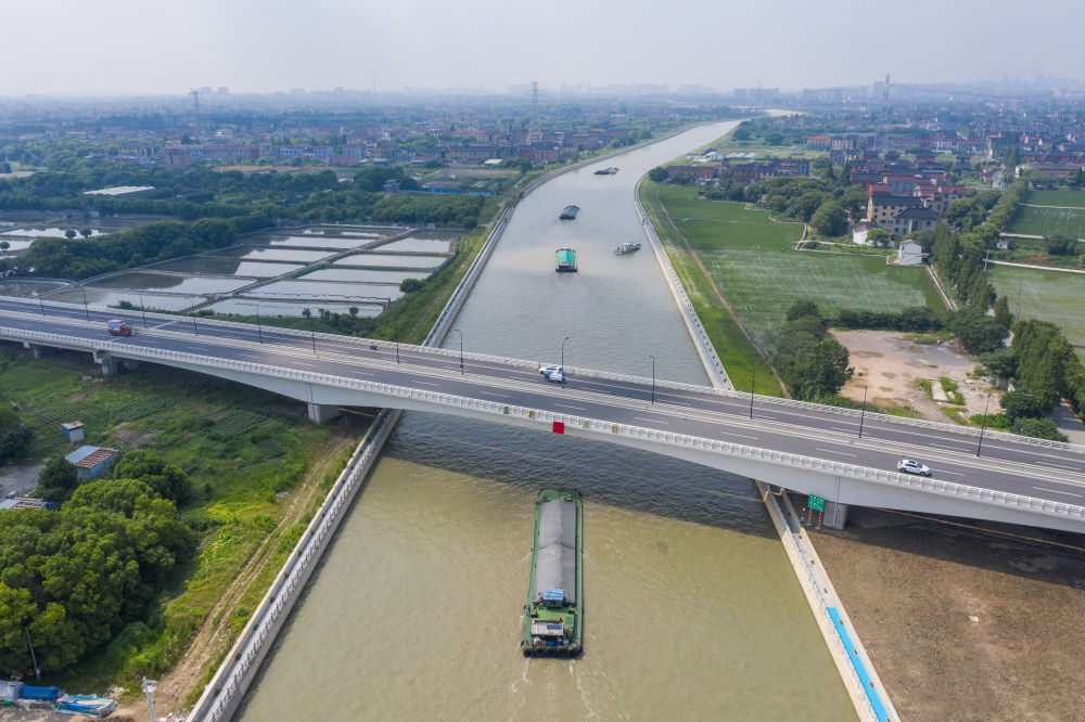 2023年7月18日,首批通航貨船進入京杭運河杭州段二通道駛往錢塘江(無人機照片)。新華社記者 徐昱 攝