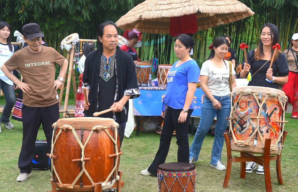 鼓聲從青秀山山腰的非遺展示區傳來,一旁的游客們跟隨打鼓人的節奏參與其中,或擺動鼓槌,或隨聲舞動。
