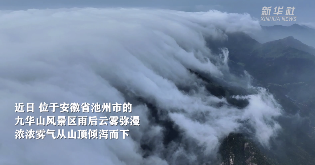 近日,位于安徽省池州市的九華山風景區雨后云霧彌漫,濃濃霧氣從山頂傾瀉而下,似白浪奔涌。