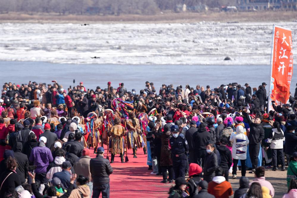“開江了!開江了!開江了!”萬余名市民相聚在黑龍江省佳木斯市的外灘廣場和棧道上,身著薩滿服飾的赫哲族組成的祈福隊伍,面朝松花江佳木斯段江面,喊出了對風調雨順的期待和對美好生活的祝愿。