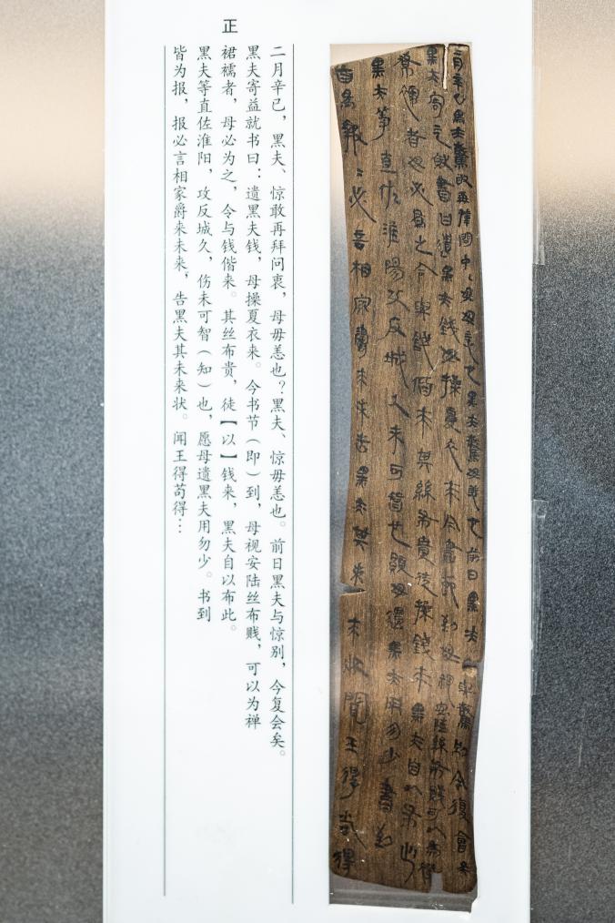 在云夢縣博物館內,兩枚木牘家書的復制品陳列在展柜中,“烽火家書”四字一下子將觀眾拉回到四方征討、干戈不止的秦楚戰場上?!啊逗诜蚰緺匪d內容非常豐富,它不僅為淮陽之戰提供了真實可靠的史實依據,還延伸出許多秦國軍事相關議題,如秦代士兵衣服的供給問題,以及當時的郵驛發展情況等?!痹茐艨h博物館館長張宏奎說。