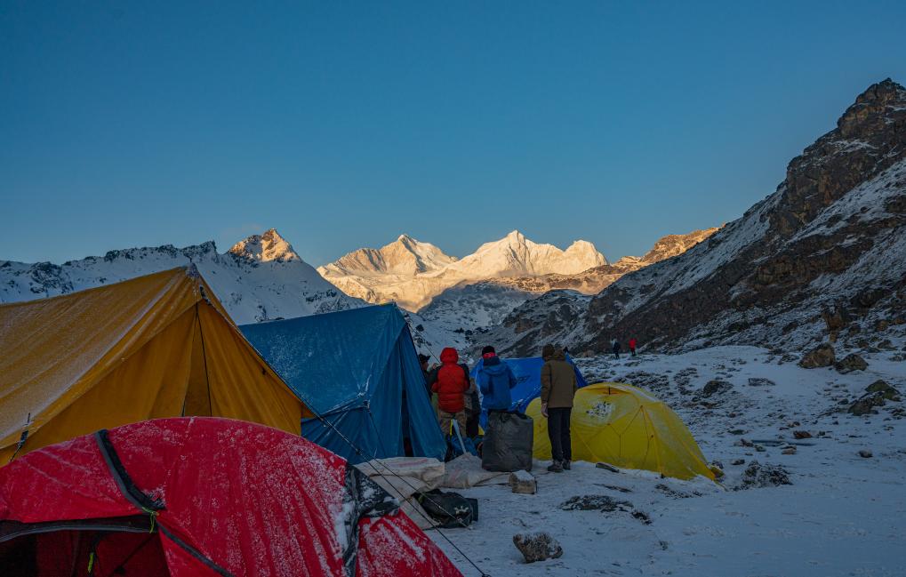 游客在嘎瑪溝中的曉烏措營地觀賞“日照金山”景象(4月17日攝)。新華社記者 楊帆 攝
