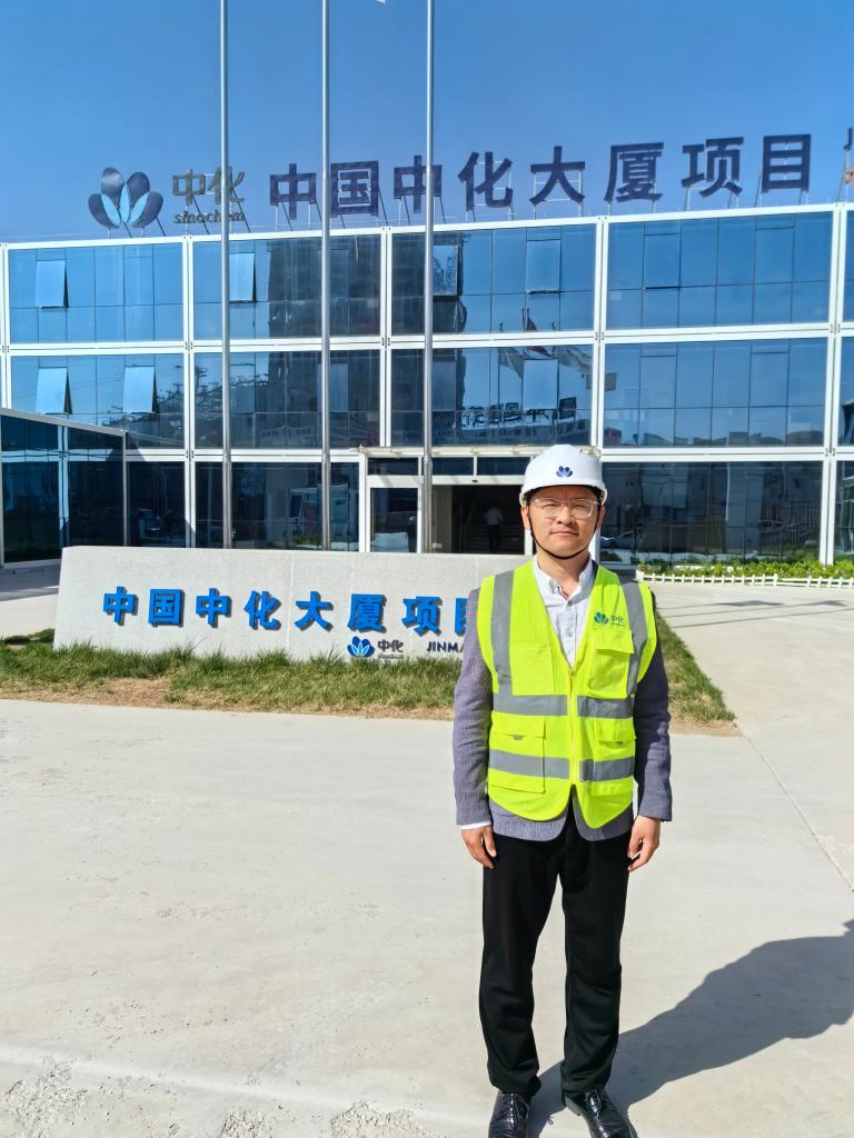張吉爍在中國中化大廈項目部門前(4月16日攝)。新華社發
