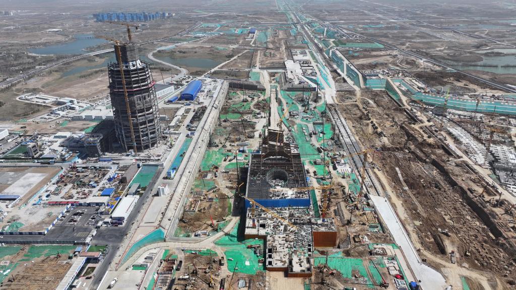 圖為中國中化大廈與雄安城際站建設現場(3月29日攝)。新華社記者 牟宇 攝