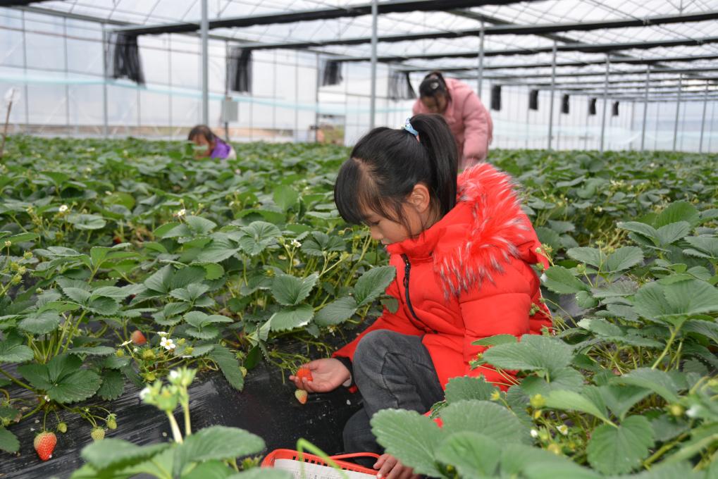 建陽區麻沙鎮一處草莓大棚內,小朋友們在采摘草莓。新華社記者張華迎 攝