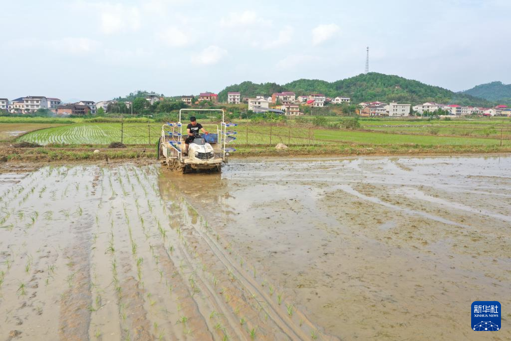 4月23日,在湖南省雙峰縣永豐街道月龍村,農機手操作插秧機在農田里進行插秧作業(無人機照片)。新華社記者 程濟安 攝