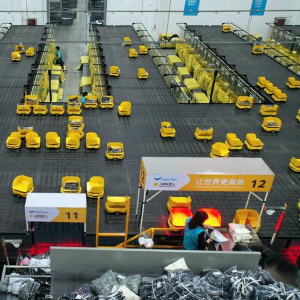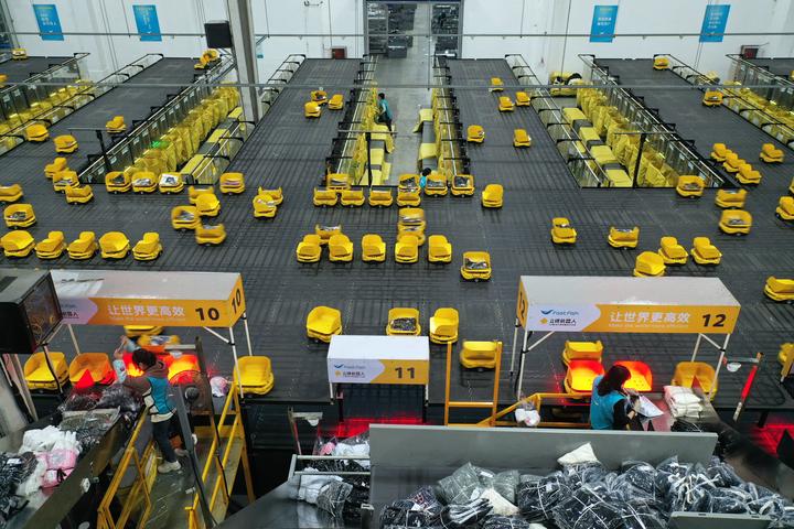 德清縣乾元鎮一家服裝企業的物流中心,分揀機器人在配送服飾。新華社發(倪立芳攝)