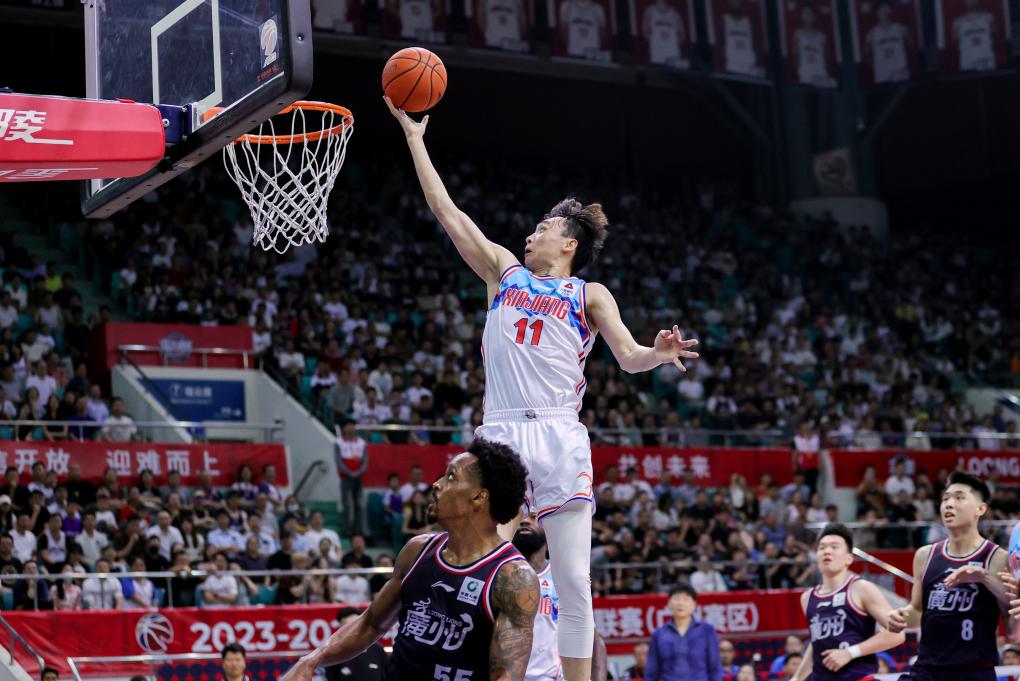 4月26日,在2023-2024賽季中國男子籃球職業聯賽(CBA)8進4第四回合比賽中,新疆伊力特隊客場93:71戰勝廣州龍獅隊,以3:1的總比分晉級四強。新華社發(黃晉文 攝)