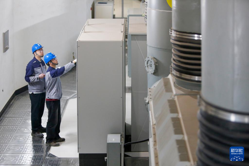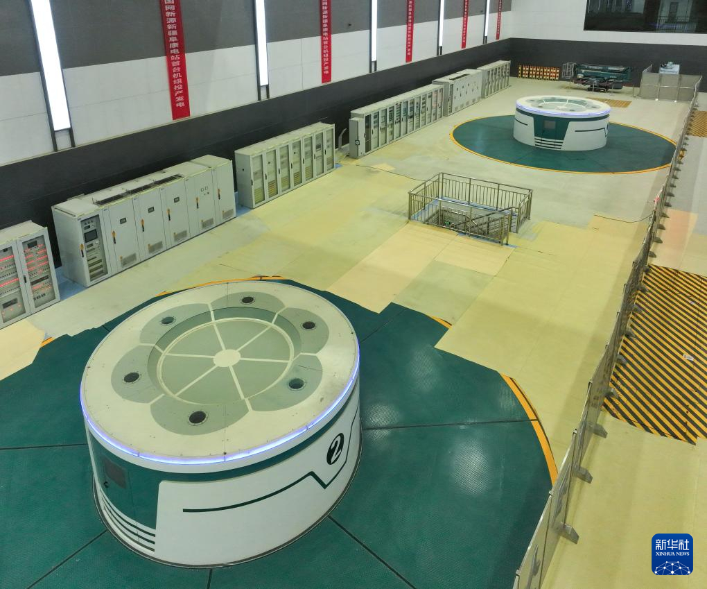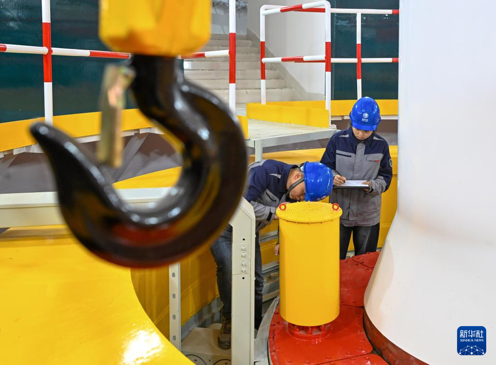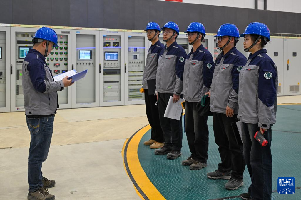 4月23日晚,工作人員在國網新源新疆阜康抽水蓄能電站地下廠房對3號機組進行調試。新華社記者 陳朔 攝