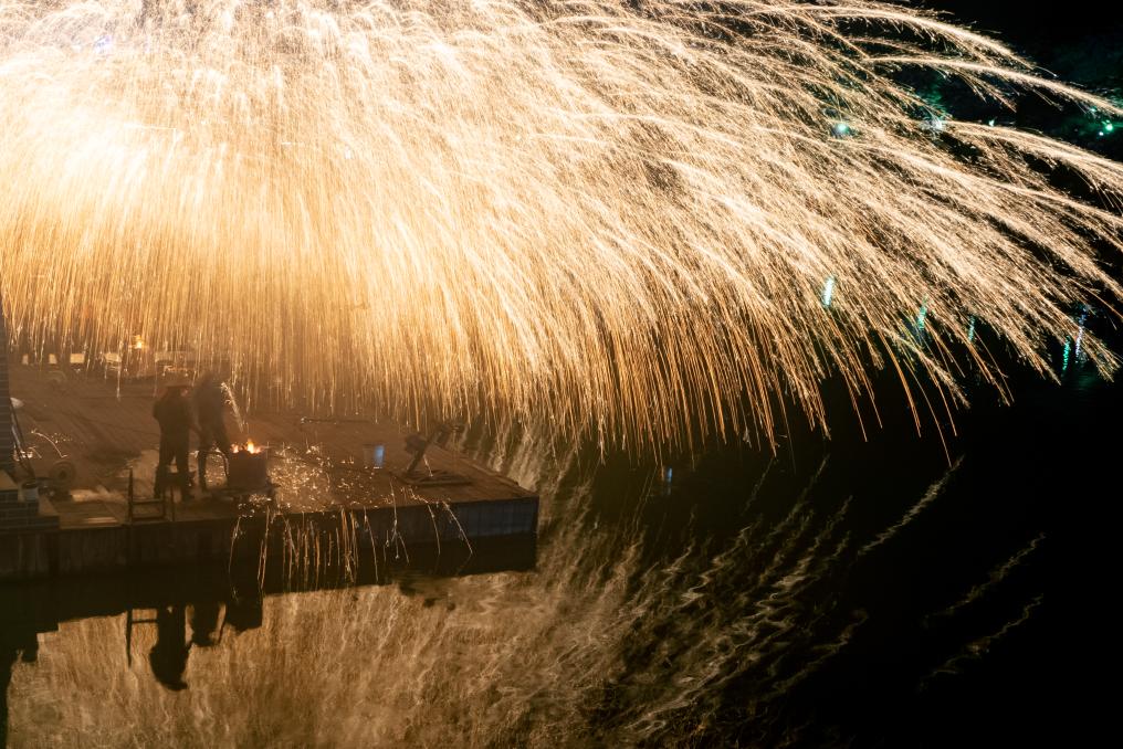 傳承古老技藝的同時,劉小松還對打鐵花的表演內容和形式進行創新,融入舞火龍等民俗元素和聲光電等科技元素?!霸谠仙?,我們研制開發了開花大、亮度高、具有阻燃性能的新型打鐵花原料,落地即滅,環保性強,安全度也高?!眲⑿∷烧f。