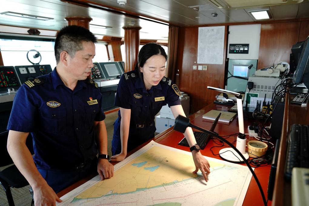詹春珮(右)在“海巡01”輪工作中(2022年6月21日攝)。新華社記者 張建松 攝