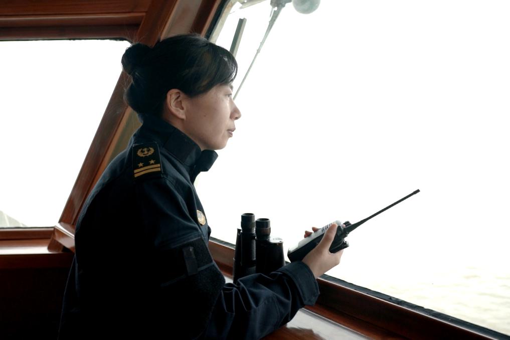 在寬敞明亮的駕駛臺,英姿颯爽的詹春珮手持對講機,有條不紊地指揮全船上下協調配合,順利駕駛“海巡01”輪緩緩駛離碼頭,直奔長江口目標海域執行專項巡航執法任務。