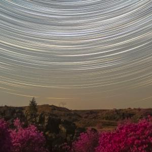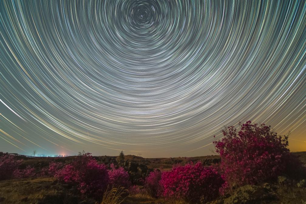 在黑龍江省牡丹江市寧安市拍攝的杜鵑花和星軌(5月1日攝,堆棧合成照片)。新華社發(王寶勛 攝)