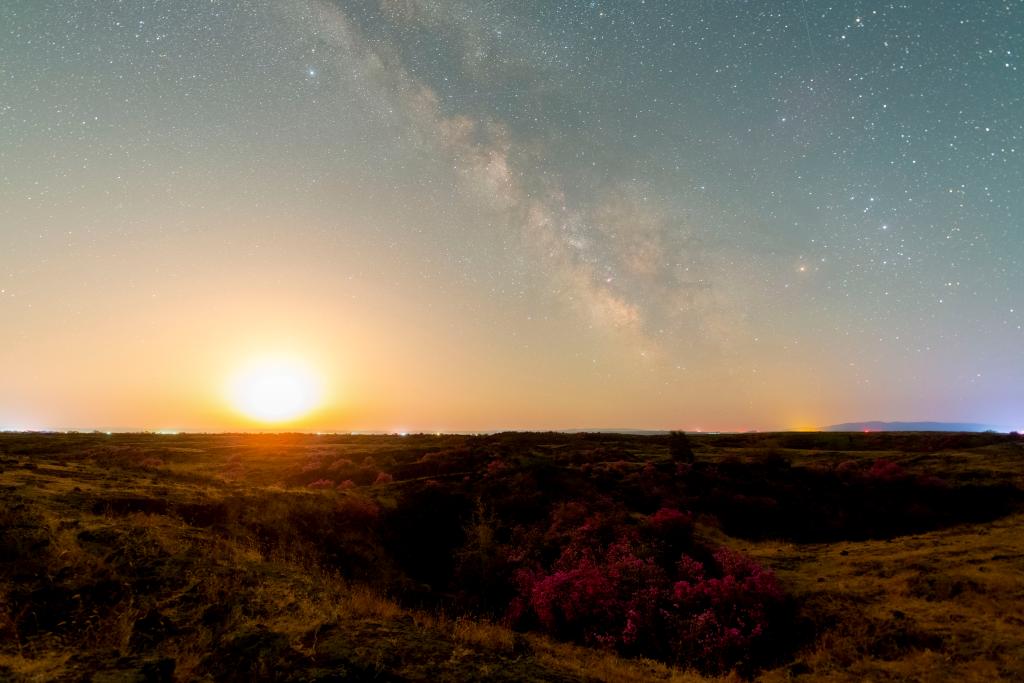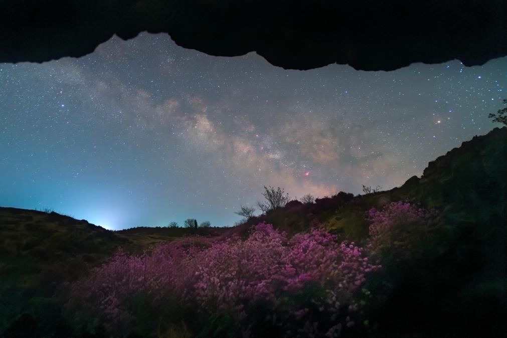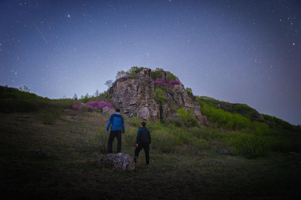 在黑龍江省牡丹江市寧安市拍攝的杜鵑花海和夜空(5月2日攝)。新華社發(王寶勛 攝)