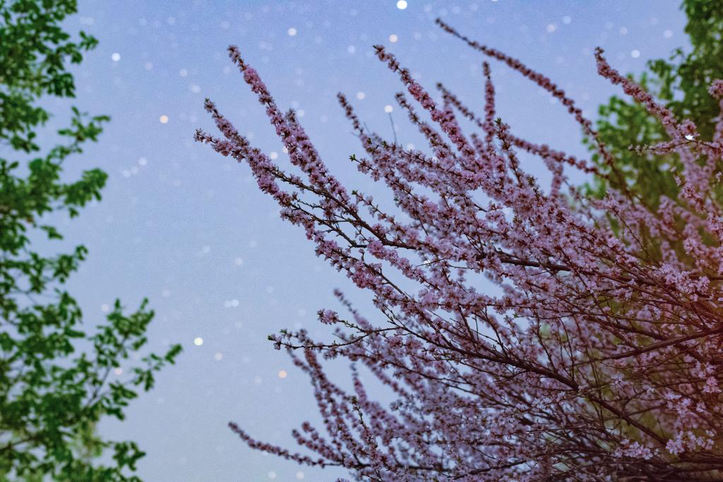 在黑龍江省佳木斯市拍攝的星空下的美人梅(4月30日攝)。新華社發(曲玉寶 攝)