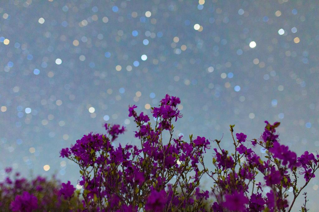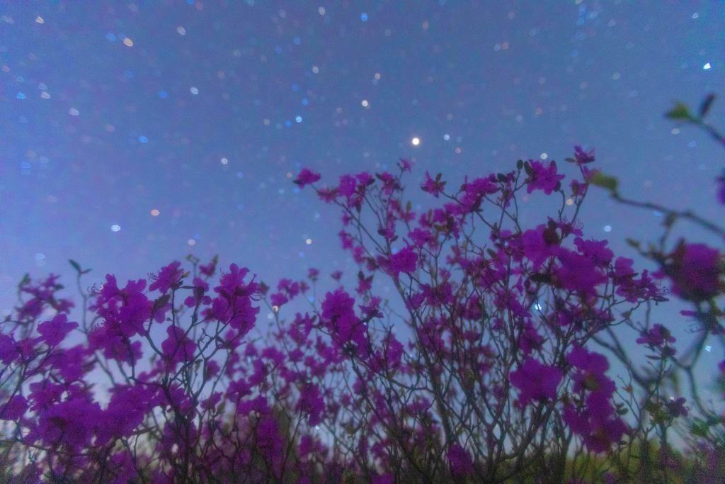 在黑龍江省佳木斯市拍攝的杜鵑花與星空(5月1日攝)。新華社發(曲玉寶 攝)