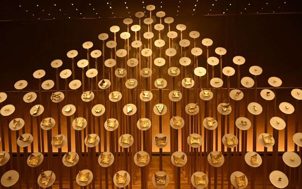 《管子·輕重甲》載:“楚有汝、漢之黃金”。楚地盛產黃金,貨幣制度發達。158枚楚金幣布成的“金山”如同暗夜繁星,吸引了眾多游客的目光。楚金幣是博物館特色藏品之一,有龜版形、楔形和圓形,并印有“郢爰”“陳爰”等印記。