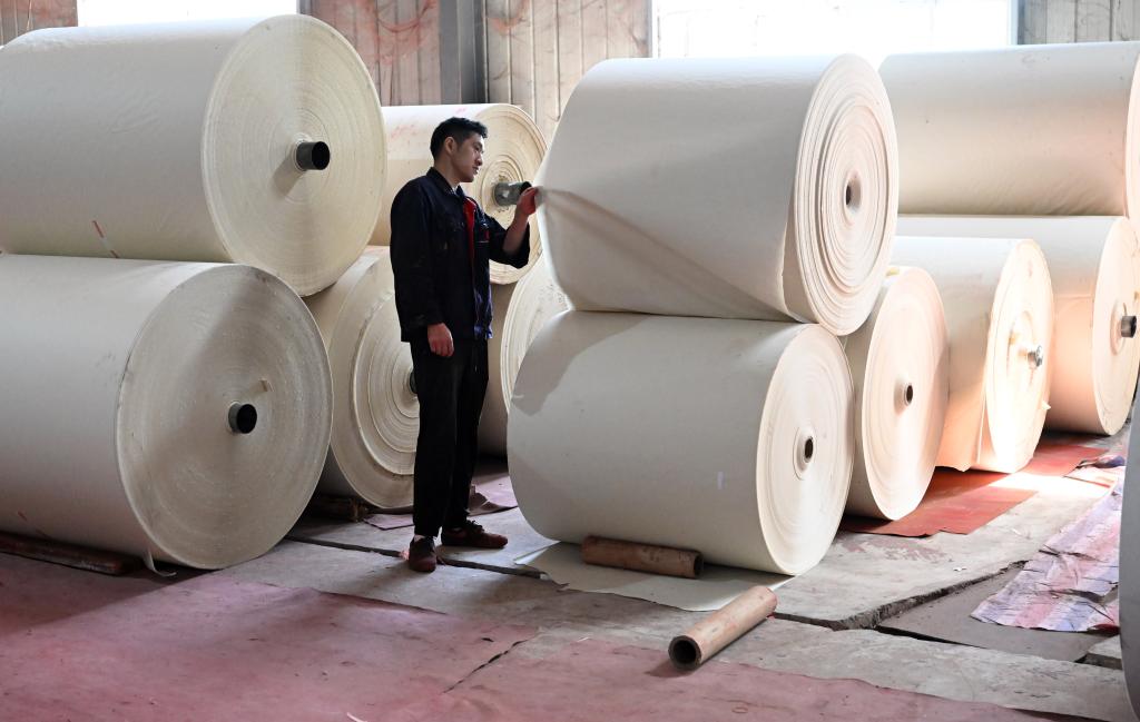 5月14日,在位于丁家橋鎮的安徽省涇縣三星紙業有限公司,工作人員查看機器加工的書畫紙。新華社記者 周牧 攝