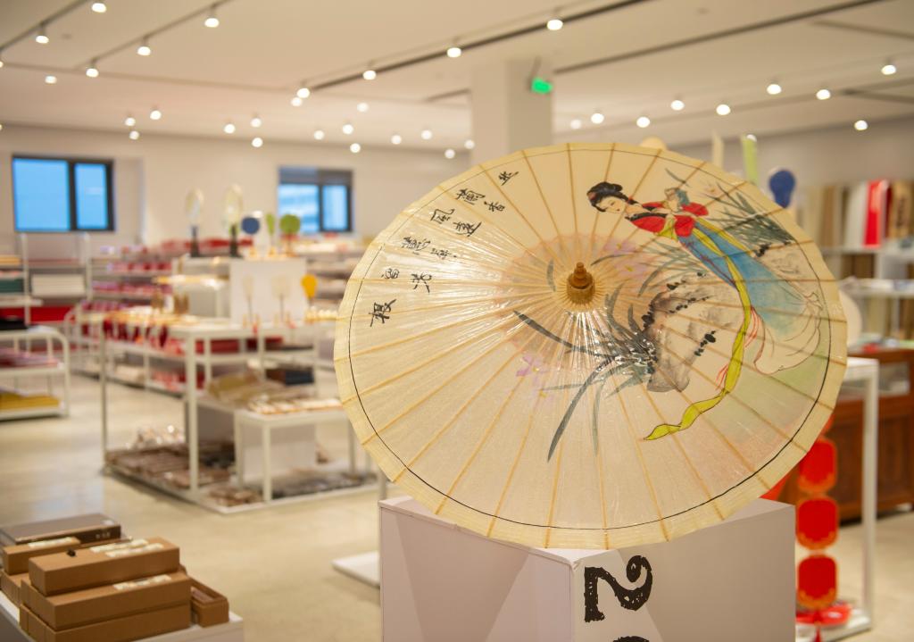 3月6日在位于丁家橋鎮的宣紙產業園一家店鋪內拍攝的油紙傘等宣紙文創產品。新華社記者 傅天 攝