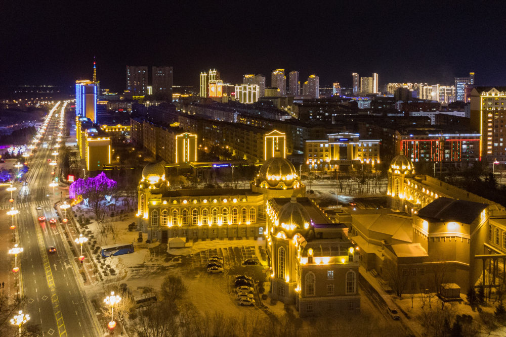 這是2024年1月31日拍攝的黑河市夜景(無人機照片)。新華社記者 謝劍飛 攝