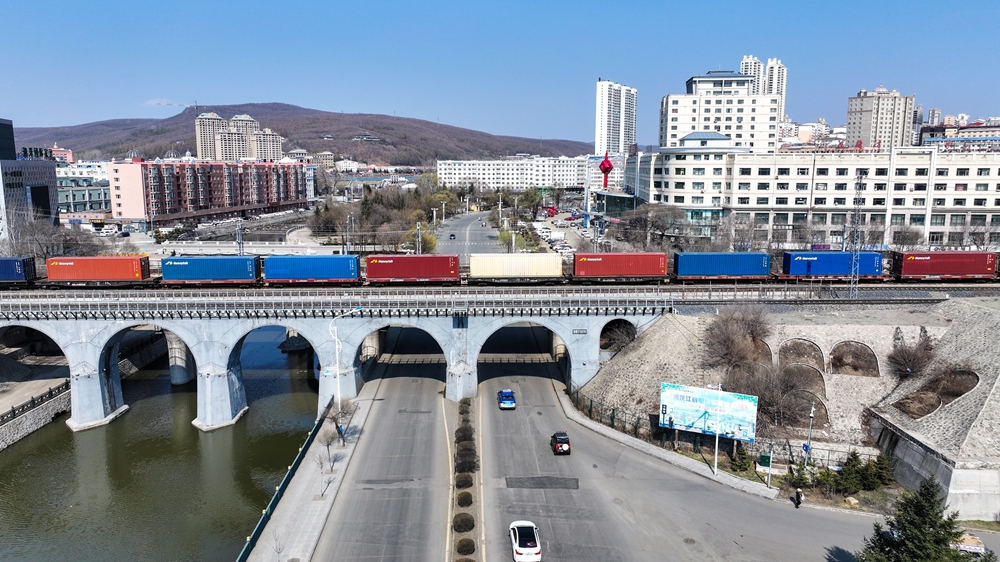 2024年4月21日,一列出境的中歐班列在黑龍江省綏芬河市區穿行(無人機照片)。新華社發(曲藝偉攝)