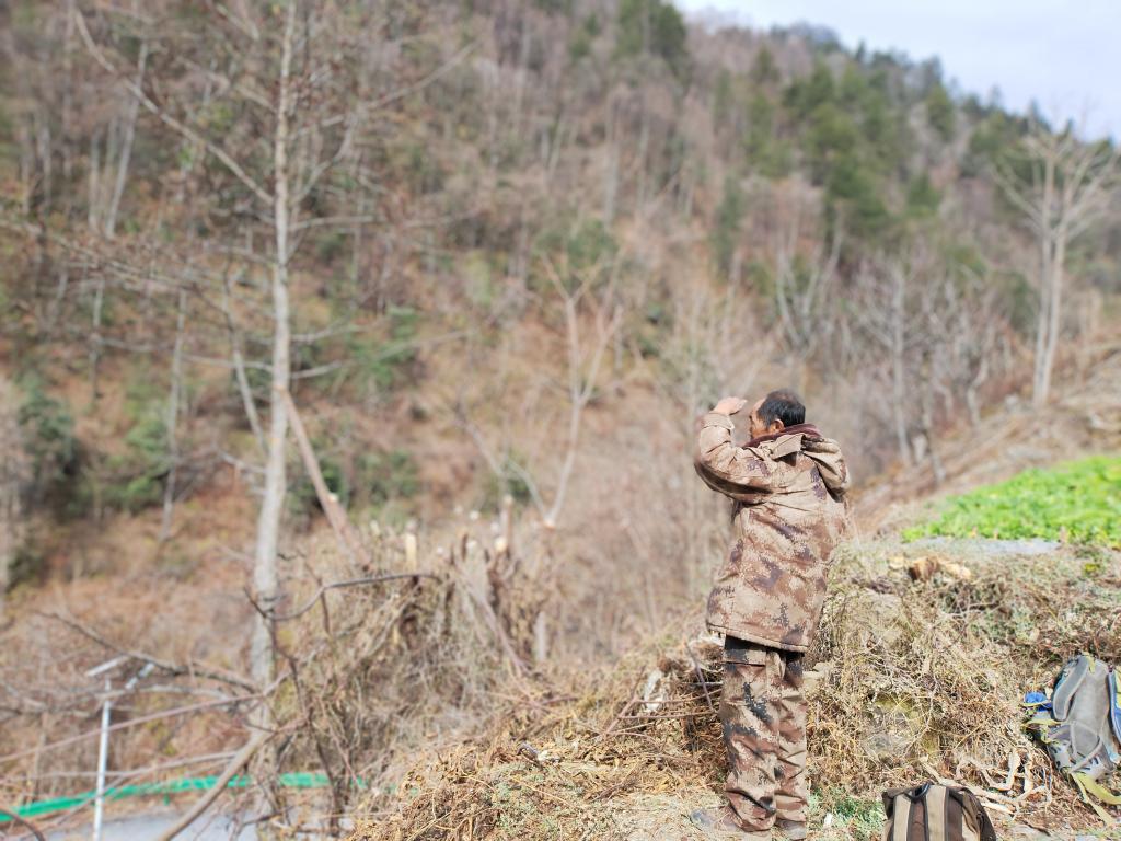 余建華正在尋找滇金絲猴猴群的位置(2月27日攝)。新華社記者浦超 攝
