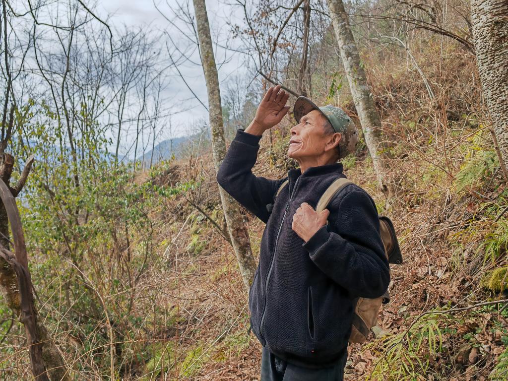 早晨天剛亮,72歲的護猴員余建華就背上行囊出發,走向大山深處,找到滇金絲猴猴群的位置,然后一直跟在猴群附近,直到天黑才下山回家。