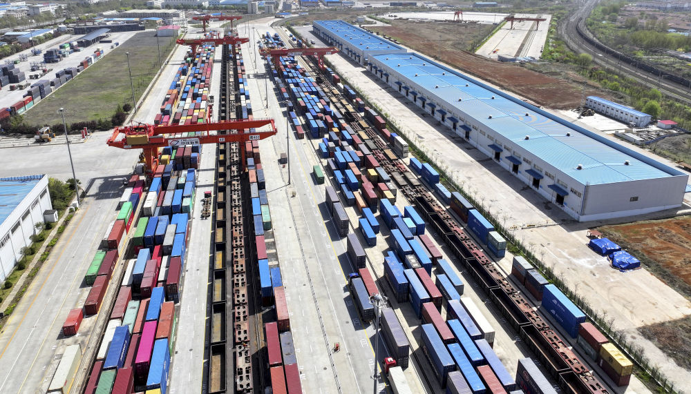 這是2024年4月15日拍攝的位于山東省青島市的上合示范區多式聯運中心(無人機照片)。新華社記者 李小波 攝