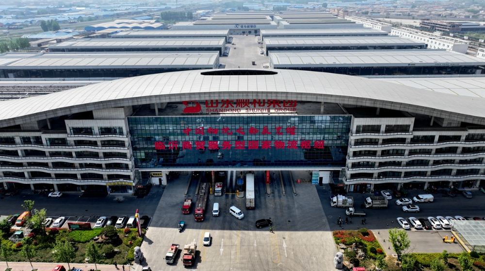 2024年4月19日,在臨沂現代物流城國際陸港片區山東順和國際智慧物流園,貨車往來穿梭(無人機照片)。新華社記者 郭緒雷 攝