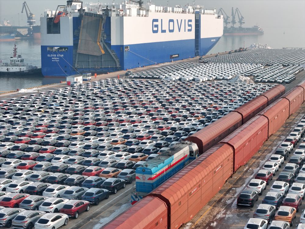 2024年1月2日,商品車海鐵聯運班列駛入山東港口煙臺港汽車碼頭(無人機照片)。新華社發(唐克 攝)