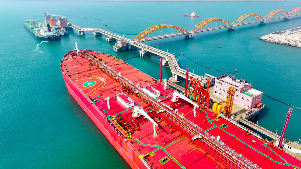 2024年3月29日,在山東港口日照港嵐山港區30萬噸級油品碼頭,船舶??窟M行卸油作業(無人機照片)。新華社記者 郭緒雷 攝