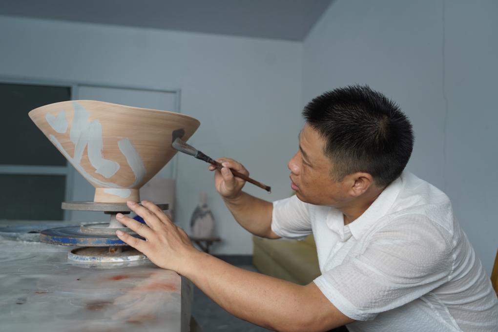 尹志軍在“字非字”陶瓷書法非遺工作室創作陶瓷書法作品。(王凱豐 攝)