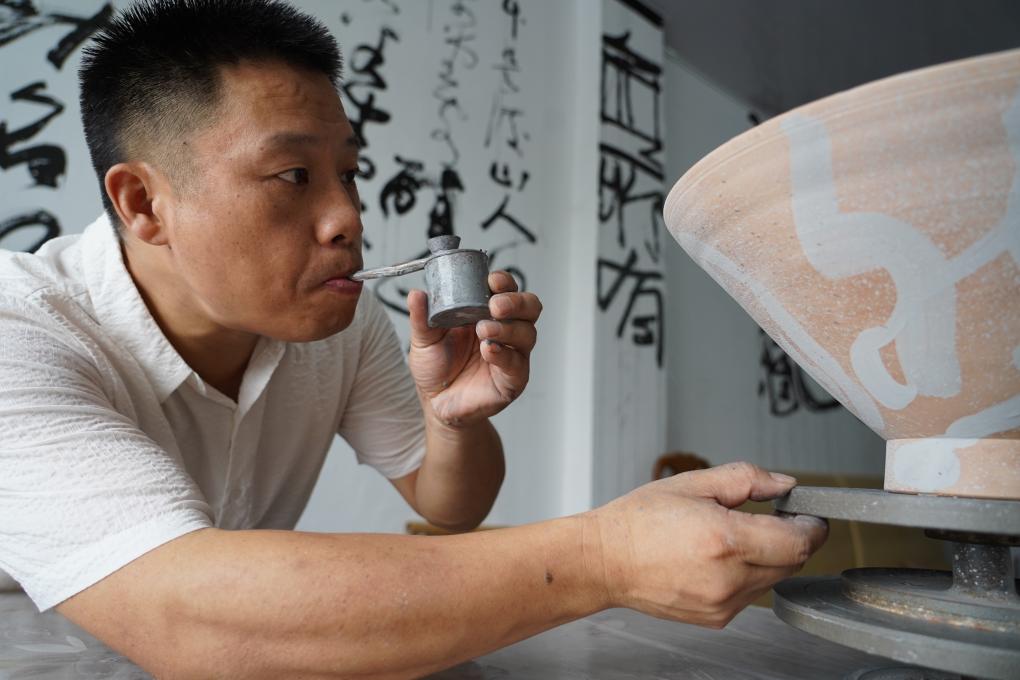 尹志軍在“字非字”陶瓷書法非遺工作室內進行吹釉工序。(王凱豐 攝)
