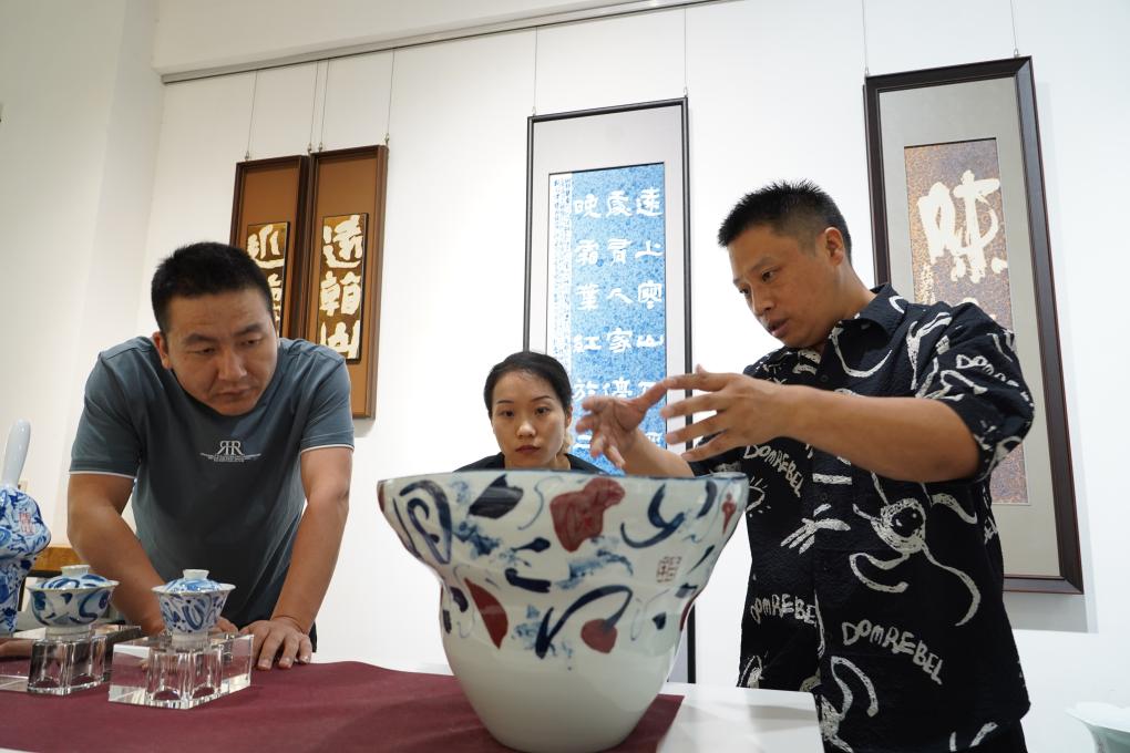 走進位于江西省景德鎮市陶藝街20號的“字非字”陶瓷書法非遺工作室里,景德鎮陶瓷書法非遺傳承人尹志軍正在向他的學生們講解陶瓷書法技巧。工作室的作品展廳內,造型風格各異的作品陳列其中,自由靈動的筆畫線條與青花釉里紅形成對比,帶來特殊的視覺效果,也讓人不禁疑問:“是字還是畫?”