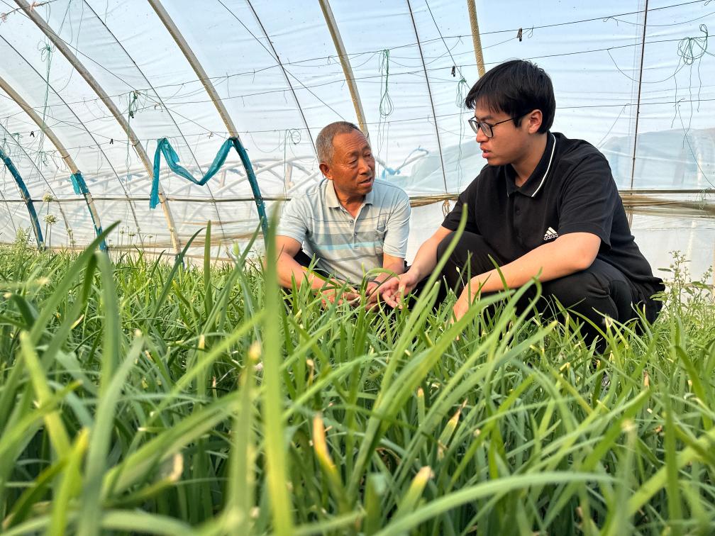 在山東省濱州市濱城區三河湖鎮大營劉村,李圣超與村干部交流韭菜生長情況。新華社記者 王陽 攝