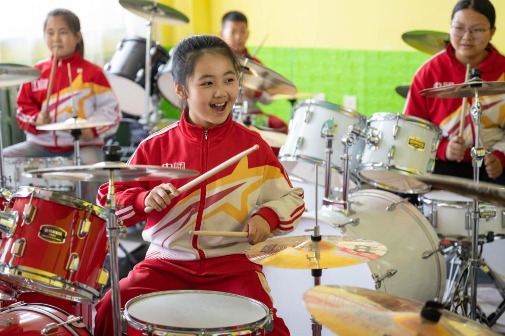 5月29日,在安達市任民鎮中心小學,“村里的孩兒”音樂班成員在教室中練習架子鼓。新華社記者 謝劍飛 攝