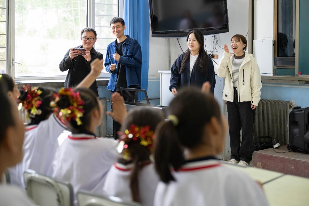 5月29日,在安達市中本鎮中心小學,李平(左二)和張雨(左一)聽“村里的孩兒”新音樂班的成員合唱時露出笑容。新華社記者 謝劍飛 攝