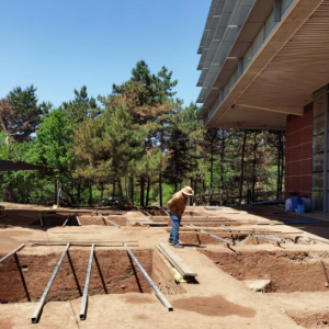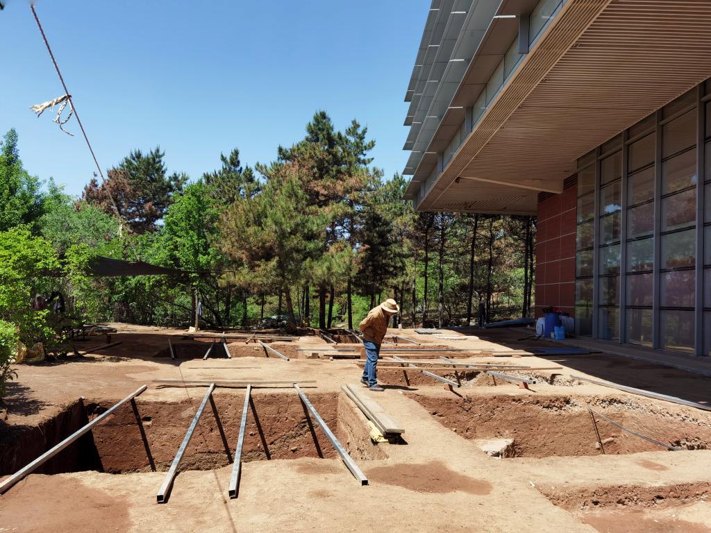 遼寧朝陽牛河梁遺址第一地點(女神廟)保護展示館外,中國社科院考古所世界考古研究室主任、牛河梁遺址發掘領隊賈笑冰和遼寧省文物考古研究院研究館員郭明正帶領隊員進行田野考古工作。