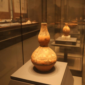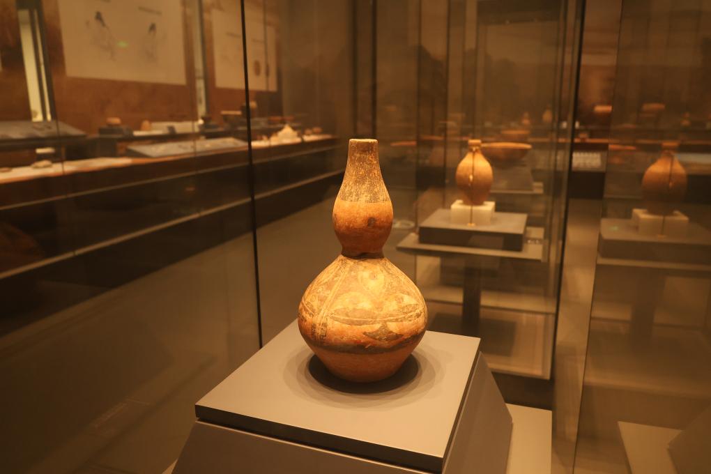 踏入博物館,一只彩陶葫蘆瓶吸引了人們的目光——這件紅陶制品的頸部上方有對稱分布的圓形幾何圖案,瓶腹位置則勾畫著由圓點、弧線和三角等組成的酷似人面的細膩紋飾。與其他彩陶器對比,陶器上的紋路顯得尤為特別。