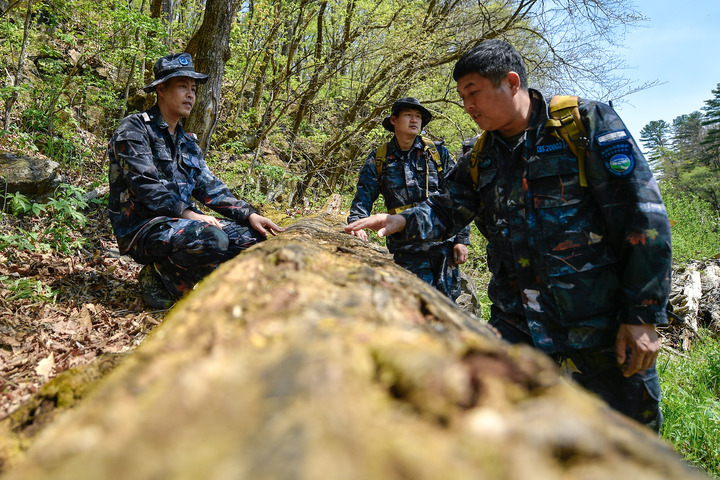 長白山自然保護管理局頭道保護管理站工作人員在巡護途中(5月8日攝)。新華每日電訊記者 許暢 攝