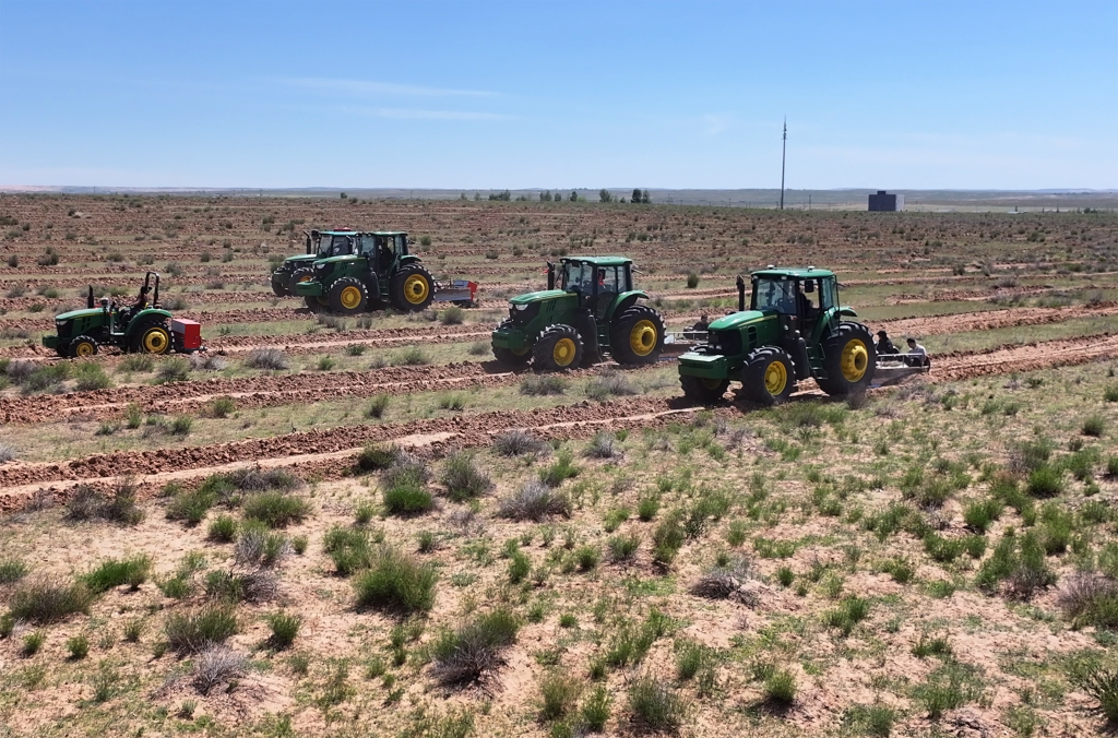 在地處庫布其沙漠腹地的鄂爾多斯市杭錦旗防沙治沙項目區,5臺牽引播種機在沙地里往來穿梭,挖溝、栽檸條、掩土等作業一氣呵成。