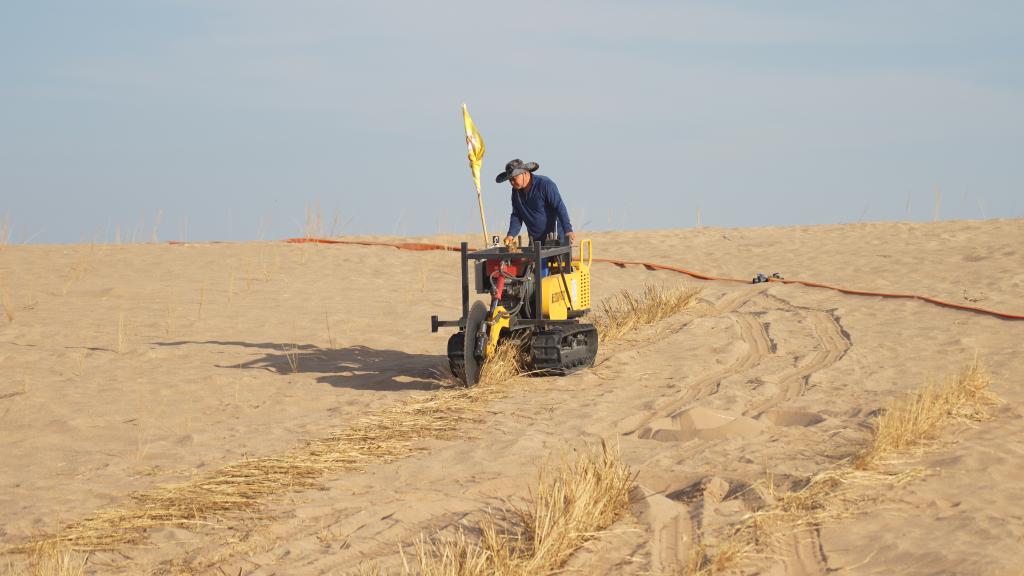 烏拉特后旗既是我國北方防沙治沙重點區域,也是陰山北麓國家級生態功能區。去年以來,烏拉特后旗加快實施陰山北麓生態綜合治理工程,采取機械造林、封育飛播等措施,進一步提升治沙效果。烏拉特后旗林草局局長陳玉云說:“烏拉特后旗沙化土地面積2065萬余畝,已治理的面積僅有459萬余畝,治理任務重、難度大,‘人海戰術’難以滿足防沙治沙需求?,F在,我們利用機械進行壓沙,不僅速度快多了,稻草扎下去的深度也能統一達到15厘米,抗風固沙能力更強?!?/p>