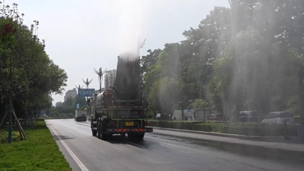 在河南省鶴壁市,霧炮車、灑水車正在開展濕掃、灑水、沖洗組合作業,進行防塵降溫。