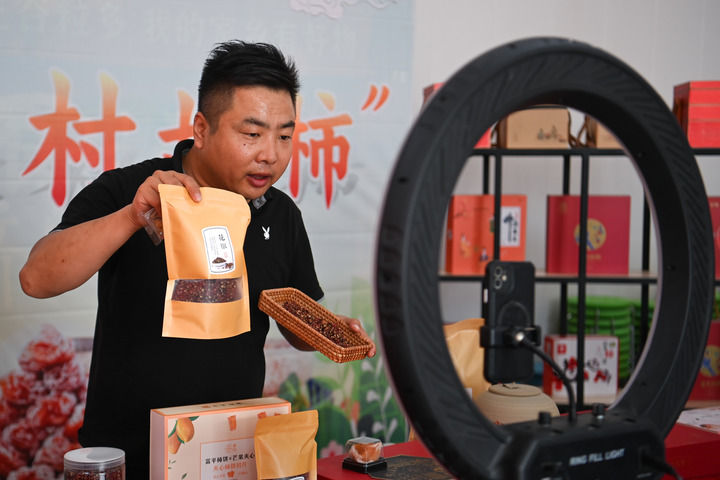 主播在富平縣莊里鎮楊家村新農人柿子產業園直播帶貨(6月22日攝)。 新華社記者 鄒競一 攝