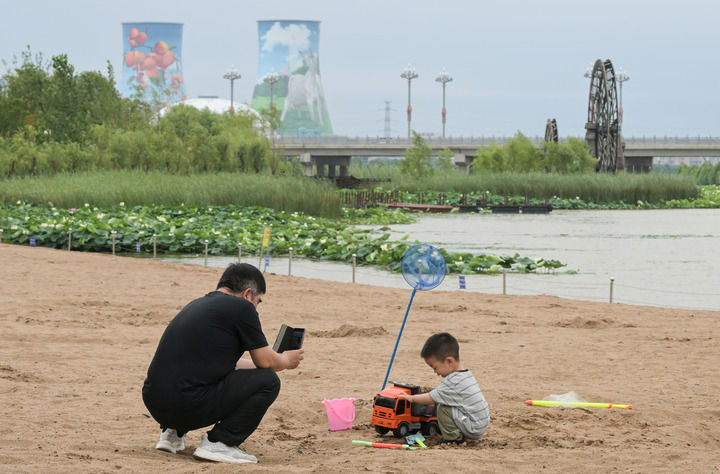 市民在富平石川河國家濕地公園岸邊的沙地玩耍(6月21日攝)。新華社記者 李賀 攝