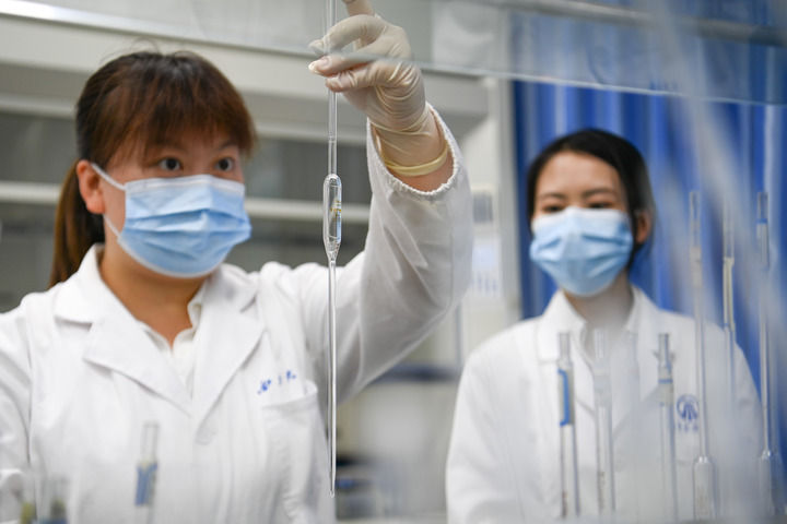 富平縣南塬水廠城鄉飲用水水質檢測中心的工作人員在檢測水質(6月22日攝)。新華社記者 鄒競一 攝