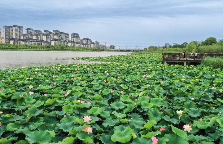 夏日清晨,富平石川河國家濕地公園,水流淙淙,荷花搖曳,水鳥嬉戲,魚群暢游……這悠閑愜意的美景,引得不少行人紛紛拿出手機拍照記錄。